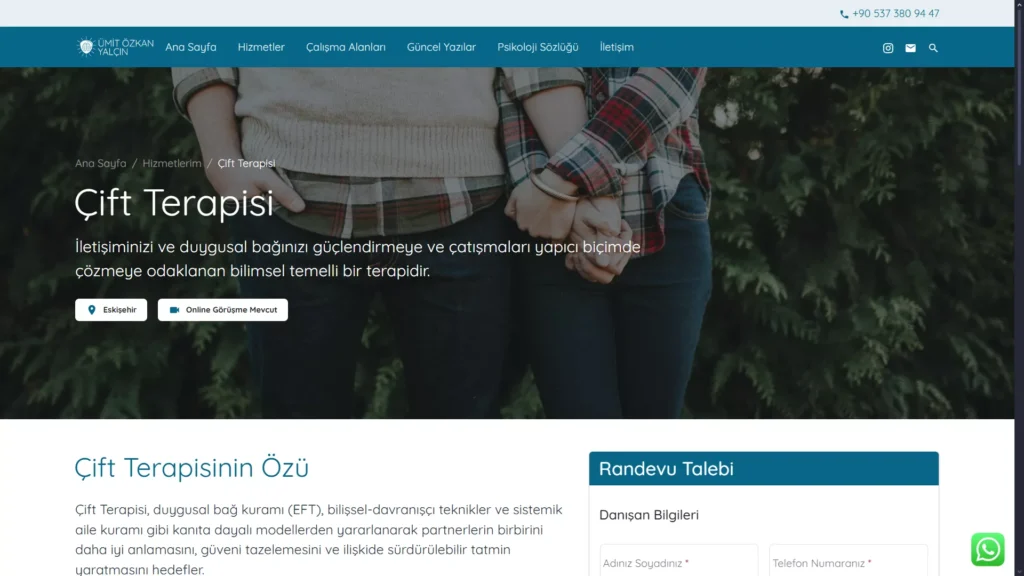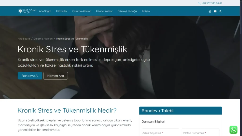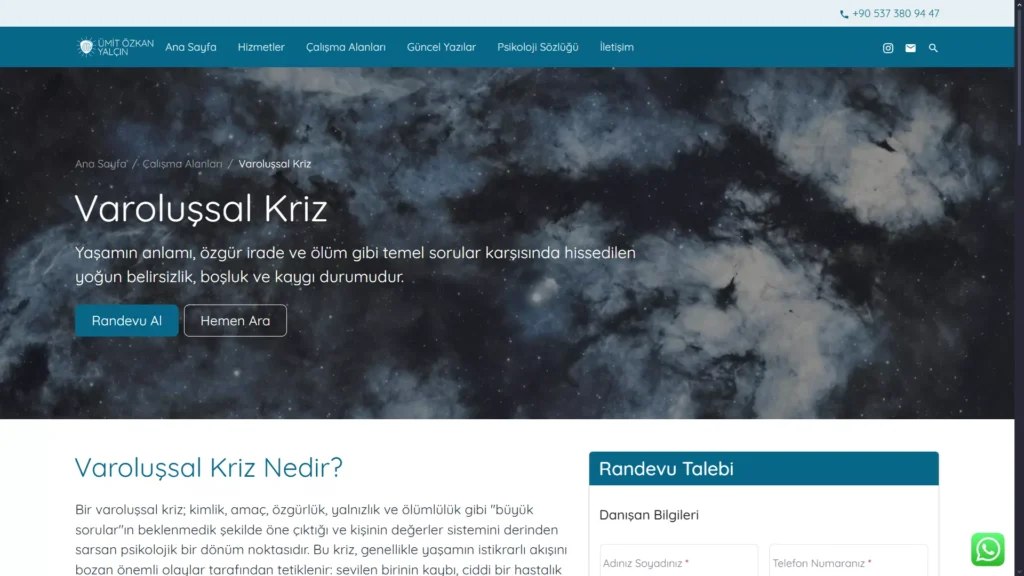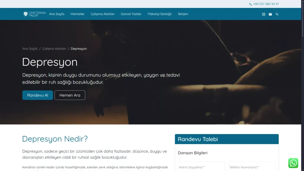 Tema içerisine sıfırdan bir randevu sistemi de kodladım. Piyasadaki karmaşık ve gereksiz alanlarla dolu hazır eklentiler yerine, sıfırdan ihtiyaca uygun, sade ve işlevsel bir randevu sistemi geliştirdim. Böylece danışanlar, artık kafa karıştırıcı formlarla uğraşmadan, sadece ihtiyaçları kadar bilgiyle kolayca randevu talebinde bulunabiliyor.